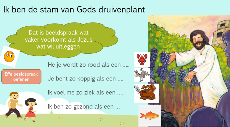 We bestuderen een wijngaard en zien een ouderwetse wijnpers waarin mensen op hun blote voeten de druiven persen, het sap eruit stroomt en wordt opgevangen om zo in kruiken te worden vervoerd. In de tijd van Jezus was Israël hofleverancier voor wijn aan Rome waar de keizer woonde. Om het verhaal van de stam en de druiven goed te begrijpen moeten we het ook even hebben over beeldspraak. Dat weten de oudere kinderen al goed hoor ‘zo rood als een kreeft en zo koppig als een ezel’ komt er vlot uit. Maar hoe zit het dan met Jezus een stam en wij de takken…?