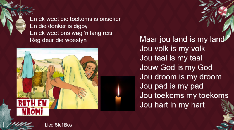 De adventsperiode is ook in het dorp aangekondigd door het thema van de visienota 'Ga mee' te visualiseren. Er staat een boom die groeit in het aantal takken. De eerste adventsweek, is er één witte tak verlicht met het verhaal van Naomi en Ruth. Naomi kwam uit Bethlehem, ook wel Broodstad genoemd. Toen er hongernood was in Israël zijn ze vandaaruit weggetrokken naar Moab. Daar woonde ze een tijd totdat haar man en zonen gestorven waren. Naomi en haar schoondochters gingen terug naar Israël. Ruth en Naomi en komen terecht in Bethlehem waar de Gerstoogst bezig is. Daar ontmoet Ruth de man Boaz en trouwt met hem. Samen krijgen zij een kindje Obed, hij is de vader van Isaï, de vader van David. De tweede adventsweek, zijn er twee witte takken verlicht. Een verwijzing naar de pelgrimage van gerechtigheid en vrede van de Raad van kerken. Het perspectief van de meest kwetsbaren is leidend met een koppeling naar Christus. In juist die kwetsbaarheid is Hij te vinden om bron van leven en hoop te zijn! De derde adventsweek, weer een kaarsje erbij tot de vierde week en dan is het kerst.